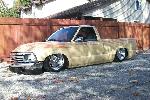 shaved every thing one off cowl hood,full sheet metal bed with small rear spoiler and led tail lights,plus a third brake light 3"body drop air accuated gas door