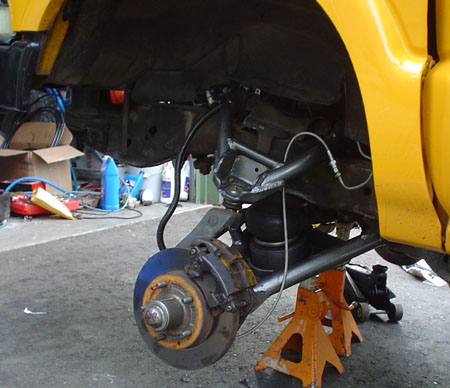 Custom lift shackles and flip kit in the back, Long travel tubular control arms, 3" lift spindles, bagged with 1/2" port firestones, Street Issue Customs bag cups, single Viair 450c and 5 gallon tank for now, 3/8 smc's, 1/2" line, 175 psi
