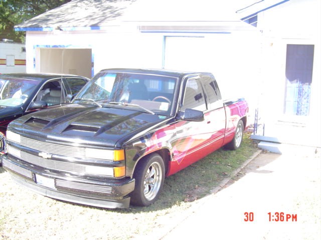 Shaved bed, electric roll down rear window, custom hood, custom red paint with way too much blue pearl. so yes it mostly looks pink