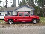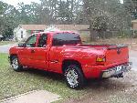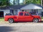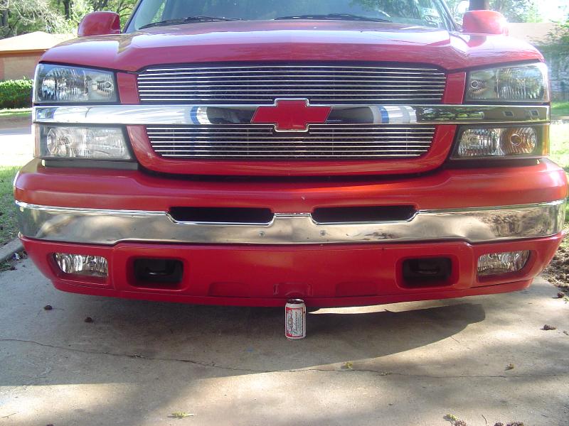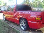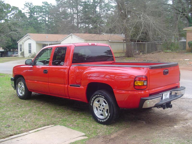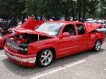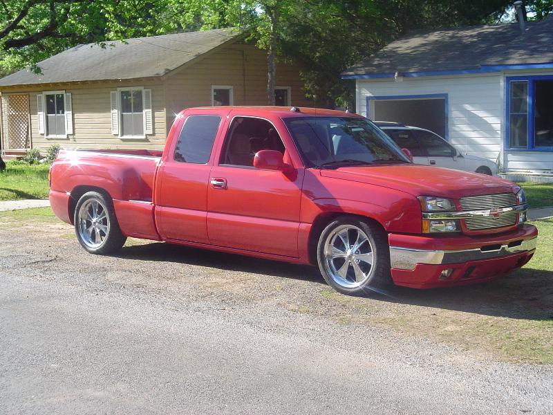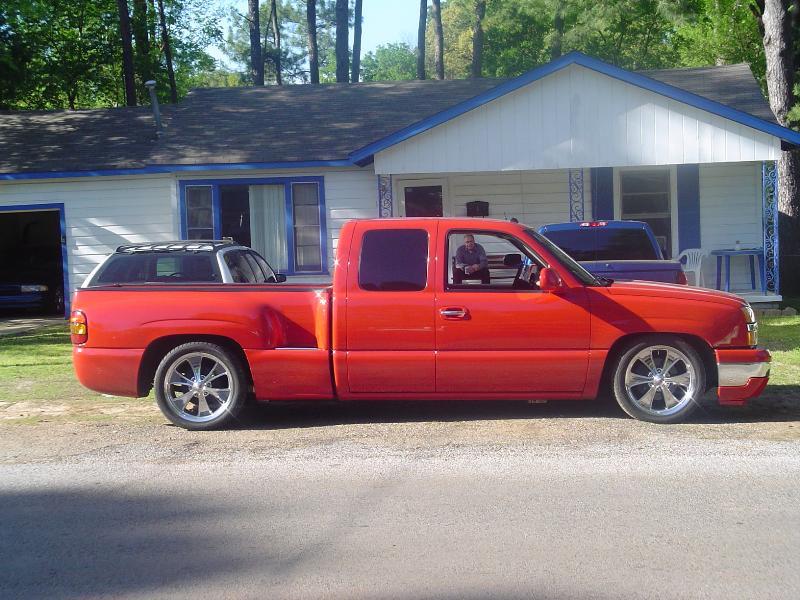 Victory Red, shaved all moldings, emblems, Roll pan, tailgate handle flip, Lo Rider bed cover, Escalade handles, painted mirrors and bumper plastic, Billet step plates, Billet grill