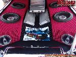 Pioneer AVIC-N4 multimedia flip out head unit, Memphis MC 15-MC620 6.5" co-axial door speakers and 3" tweeters, 2 JL Audio 10" W-1 subwoofers behind each seat, 1 Rockford Fosgate P400 amp to drive the subs and components, Playstaion 2 gaming system.