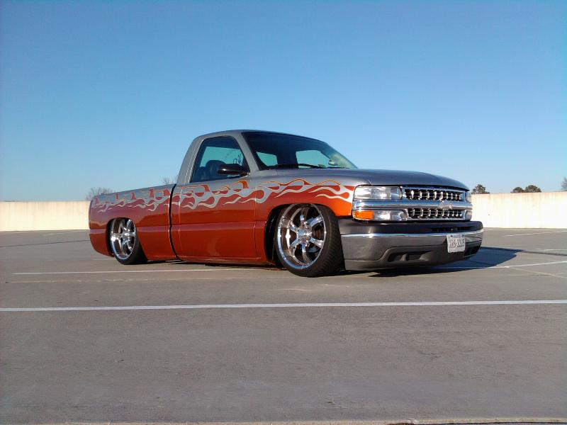 shaved handles/tailgate, custom paint (stock scion burnt orange with "ice" in the flames on top of silver) Bed is tubbed out, all round...