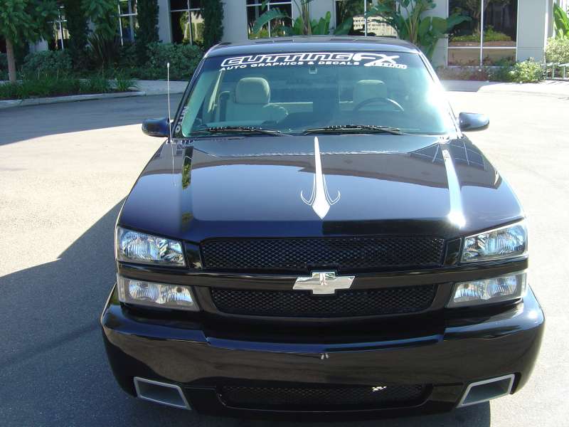 All painted BMW Carbon Black (jet black base with blue and silver metallic) with graphics and pinstriping by Steve Vandemon using House of Kolors paints. Shaved doors handles, 3rd brake light, GM Parts SS front fascia,