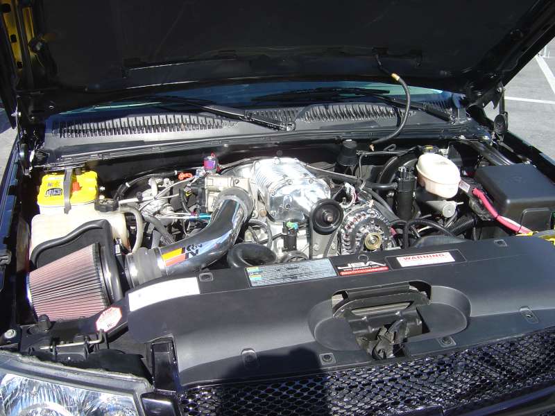Superchips programmer, Flex-A-Lite electric fans, WranglerNW 220-amp externally regulated alternator (fully polished), and a 7-pound Nitrous Express kit (custom painted bottle to match the truck).