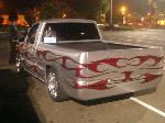 fully shaved in the back, LED'Z located between tailgate and rollpan, shaved stake pockets, 3rd brake light, 3D Billet Flame grille, smoothie steel bumper, clear lights in front, SS mirrors, AVS flame license plate holder, PAINT done by MIRANDAS KUSTOM in Visalia CA, paint is civic silver base w/ Razberry Pearl from House of Kolors tribal flames, airbrushed skulls throughout flames and on bumper