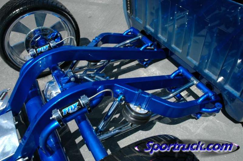 4 3/4 stockfloor bodydrop using a custom built firewall back frame. Candy blue powercoat, fox shocks, chrome, custom polished fuel cell, custom built control arms, mandral bent rails, slam bags, parker valves, chrome drive line, all wires and lines hidden inside of frame