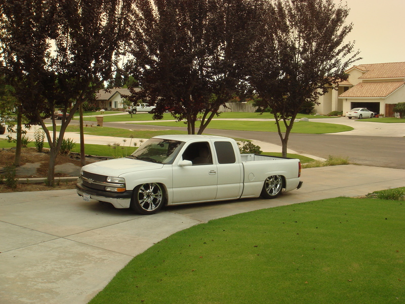 All 100% handmade parts, nothing bought except bushings. Slam RE7s all around, stock control arms for now, Wishbone rear, 2x2" lowers (31.5" long), 1.5" round wishbone (30" long), bags mounted 1/3 up lower bar, 15" lift in back, everything TIG welded