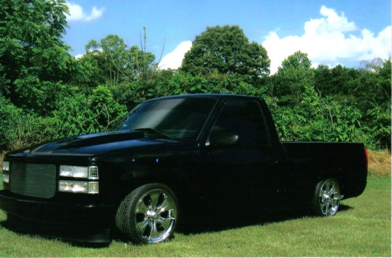 black, smoothie front bumper, roll pan, cowl hood, euro lenses, shaved stake pockets & tailgate handle, 31 bar GMC grill