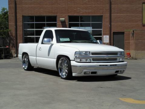 WHITE, Shaved tailgate, molded rollpan, shaved stake pockets, painted door handles, painted upper and lower bumper pads, painted mirrors, billet grille w/ billet bowtie
