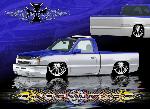 escalade rear door handles, shaved third brake light shaved tailgate and molded roll pan shved stake holes smoothed and painted bumper pad and lower valance street scene mirrors ragtop billet grill and bow tie