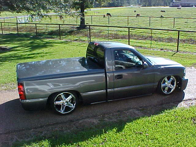shaved tailgate handle, shaved emblems, molded rollpan, ss front bumper,smooth wiper cowl, ss mirrors, upper and lower billet grilles, LoRider bedcover, escalade door handles, 03 silverado taillights, billet shorty antenna,