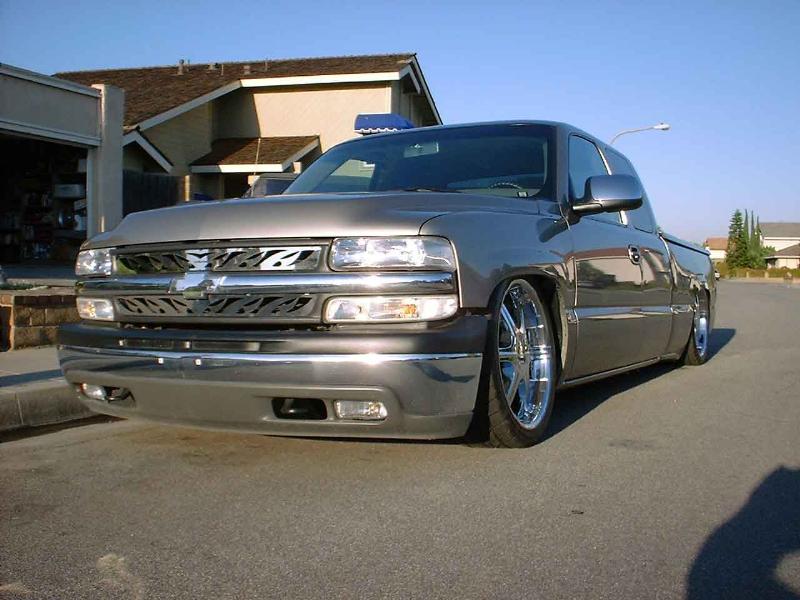 SHAVED TAILGATE, MOLDED ROLL PAN, APC CLEAR CORNERS, APC EURO TAILS PAINTED CANDY RED W/ MATCHING 3RD BRAKE LIGHT, DJ MOTORSPORTS GRILL W/ BILLET BOWTIE, SIR MICHAEL'S ROLL PAN, TRENZ BILLET ANTENNA...SOON SOME SICK AZZ TRIBAL FLAME GRAFIX COMMING OFF THE FRONT WHEEL DOWN THE SIDE OF THE BED