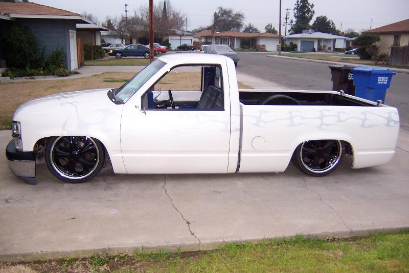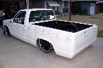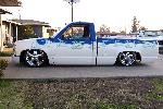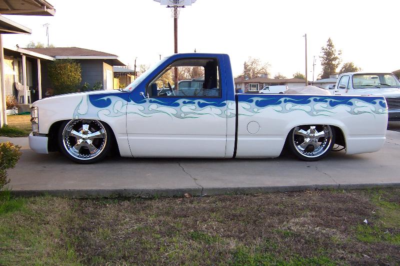fully shaved tail lights, tail gate welded shut, roll pan, doors, upper bodyline, stake holes, mirrors,section an inch either way out of the bumper,bed tubbed,custom maltese cross mirrors,custom two tone paint pt cruiser electric blue on top escalade white on bottom with metallic silver flames seperating them striped in hok lime green