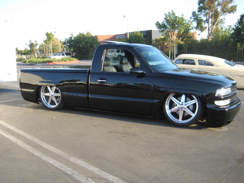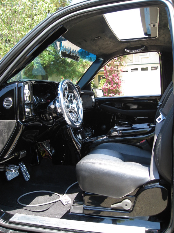 All plastic painted, Lots of billet including; Trenz one piece steeringwheel, Trenz flame rearview mirror, Trenz flame door sills, Trenz flame pedals, Trenz heaterbox cover, billet dash kit, billet shifter, and empire billet vents. Headliner shaved with Suede. Escalade guages. 04 silverado bucketseats with black leather and suede inserts katzkin covers, 02 Yukon center console.