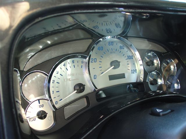 Graphite/Ice Grey Katzkin leather, BLUE LED Bulbs in the interior, Stainless Steel Hummer face gauges with Escalade Platinum chrome Bezal and escalade white needles. Billet Shifter, Billet lighter, Billet a/c and headlight knobs,Billet haedlight switch cover and knob, Billet heater box cover, Painted dash, Painted steering wheel, Billet rear radio controls, Billet grab handle, Suede headliner
