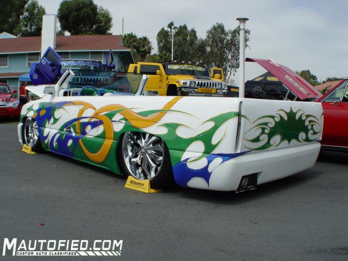 Fully Shaved, Unibodied, Convertible w/4" chopped windshield, full custom graphics using HOK paint and pearls