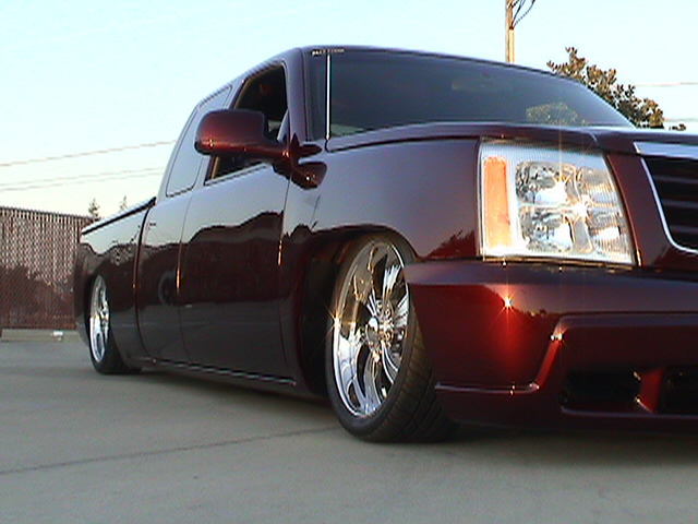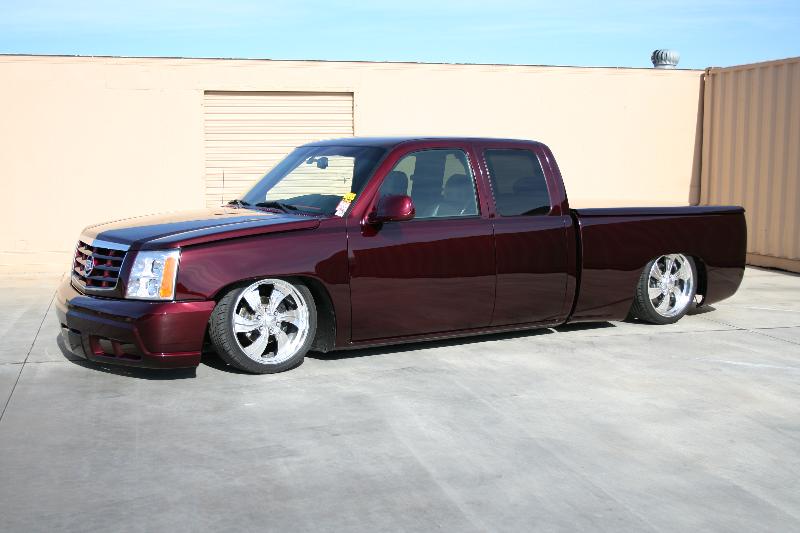 SOLD - House of Kolor Burgundy Kandy Paint, Caddy Clip, Molded shut bed with color-matched LEDs, FULLY SHAVED including ALL BODY LINES. Paint & Body done by Carlos Trejo @ Kaotik Kustoms in Reedley, CA.