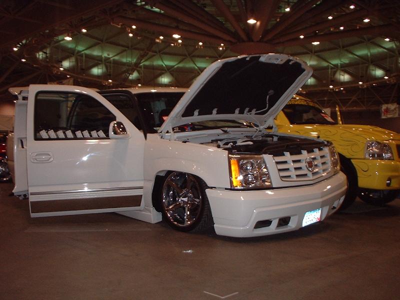 2002 Cadillac Escalade conversion; Xennon ground effects; Leer fiberglass lid; Bedrug carpeted bed rug; Euro clear taillights; Hyper white headlight bulbs; Painted moldings; Painted APC smooth wiper cowl; escalade door handles; Painted grille; Chrome rocker panels; Cadillac engine covers painted white; limo tint and 20% whole windshield,escalade emblems,DUB badge
