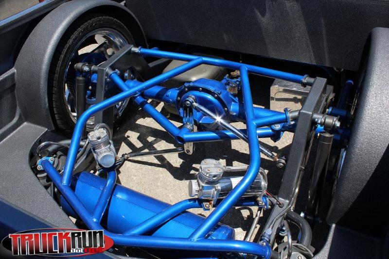bodydropped 3" with a 3/4 frame, parallel 4-link/ 6-link with a one-off billet watts link. everything painted charcoal grey or powdercoated candy blue. ALL BY FICTION FABRICATION