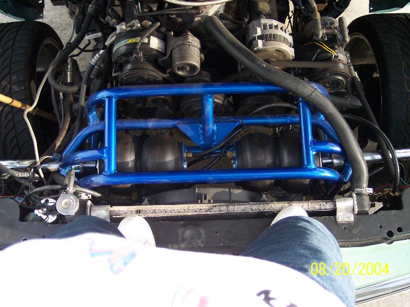 Lays door on 22"'s. HS 82's in front hybrid with 10 in chrome rams and hs 82's out back on powdercoated escalade blue cantilever four link. Full 2x3 tube frame front to back. All hand made front a-arms. All tubular crossmembers all podercoated along with a powdercoated gray/silver frame