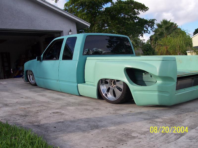 stock floor layin door on 22s. Fully shaved, full primer. Molded on 2003 toyota tundra tailights. Custom rollpan w/o license plate box because thats all they sell for stepsides with stepshavers, raised, widened and reshaped rear fenders to match lights and to clear for 22's. Sheetmetal and rhinolined bed. Shaved and rhinolined firewall. Booster relocated to underneath driver stepside.