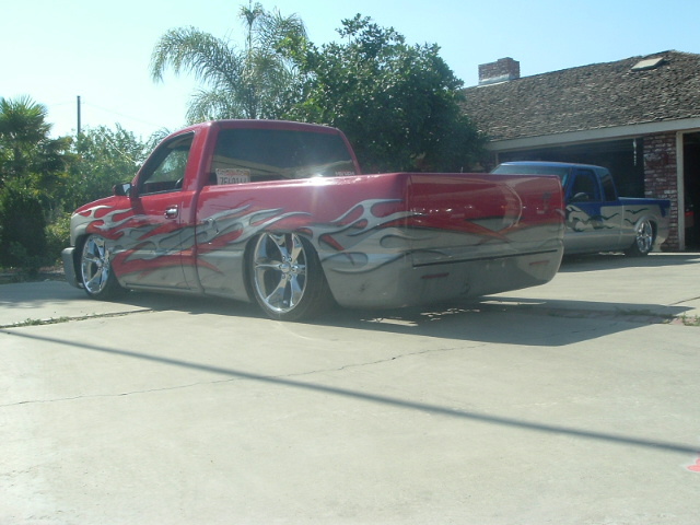 ss front bumper, custom cleared lights, tailgate shaved with molded in rollpan,2 LEDS in pan, shaved 3rd brake, ss side mirrors, billet grill,cadillac handles, custom flames