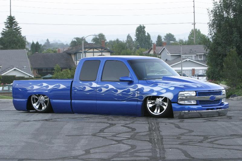 shaved handles, antenna, taillights, stake bed pockets, Grant Kustoms skin combo(rear molded shut)Painted Tru Blu with silver metal flake flames/Matrix System Paint/Blue sprayed by Musso Motorsports/ graphics and pinstripping by Kaotic Ryan