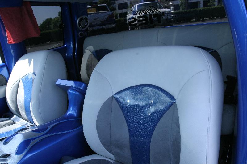 Shaved dash, custom door panels, chopped buckets, custom headliner, seats done in light grey Enduratex, dark grey suede, and blue glitter vinyl, grey Mercedes carpet, custom center console, all work by Plattinum Audio Designs