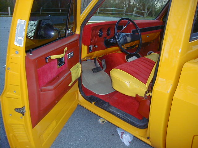 its has a yellow @ red seat with the dash is painted yellow with red velvet covering over the dash. it also has red carpiet with tinted windows.