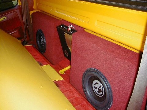 it has sony cd player with 2 memphis 10in subs with 2 6in threeway memphis speakers in the kick panels. it has a memphis amp mounted behind the seat with the custom built boxes for the subs covered in red carpet. it has some tweets beside the sunvisiors and 2 6x9s in the right and left rear of the rocker panels.