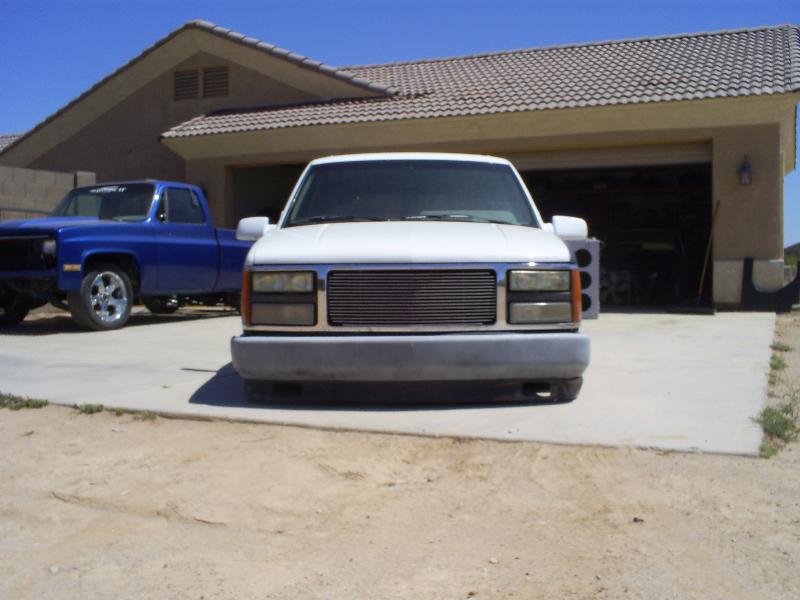 white and silver two tone. roll pan, smooth front bumper gmc grill.