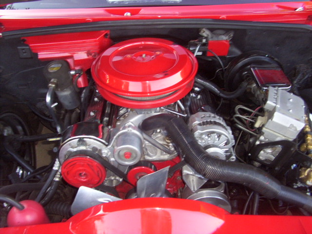 New motor: 355 cu Chrome Valve Covers, Custom air Cleaner, Lots of shiny stuff Powder coated brackets.Oil Cooler,Pete Jackson Noisy Gear Drive, March power pullys,Hot Cam, York 210 Compressor,Flowmaster Exhuast 2.5 no cats,Painted Block, Billet Freeze plugs,Chrome oil pan, timing cover, fuel pump block off,Vacumn Advance cover,Chrome Demon fuel line,Polished Summit fuel regulator,Aeroquip 3/8 Fuel line, Holley Blue fuel pump,15 gal powdercoated red aluminum fuel cell with sump and GM sending unit. Chrome AC comp cover, Stainless nuts and bolts,Accell 8mm 9000 plug wires, Now a Carb motor with a Edelbrock intake, And Demon 650 electric Carburator,Demon return spring setup, with a HEI dist full rebuilt with new vacumn advance, ignition module, radio module,magnetic pickup, and new coil, cap, rotor,Optima red top Battery,All wiring stretched and hidden. 4l60E trans with 2 coolers and lots of other crap