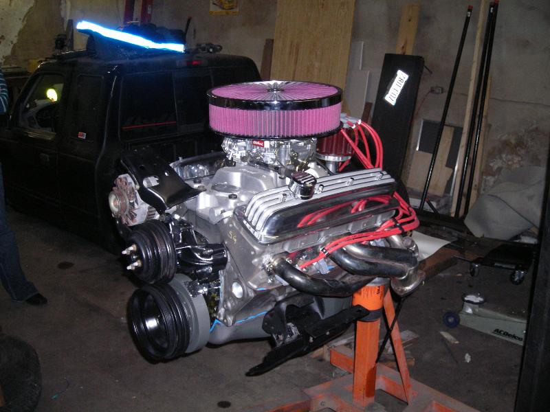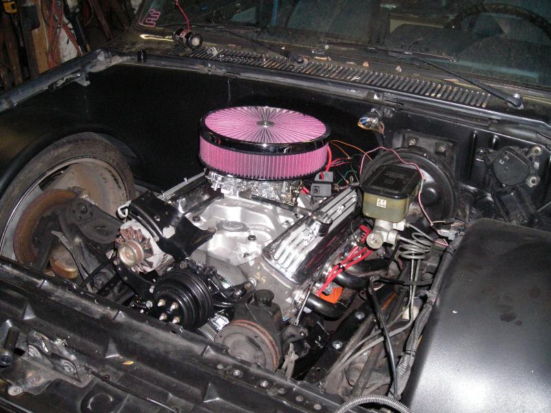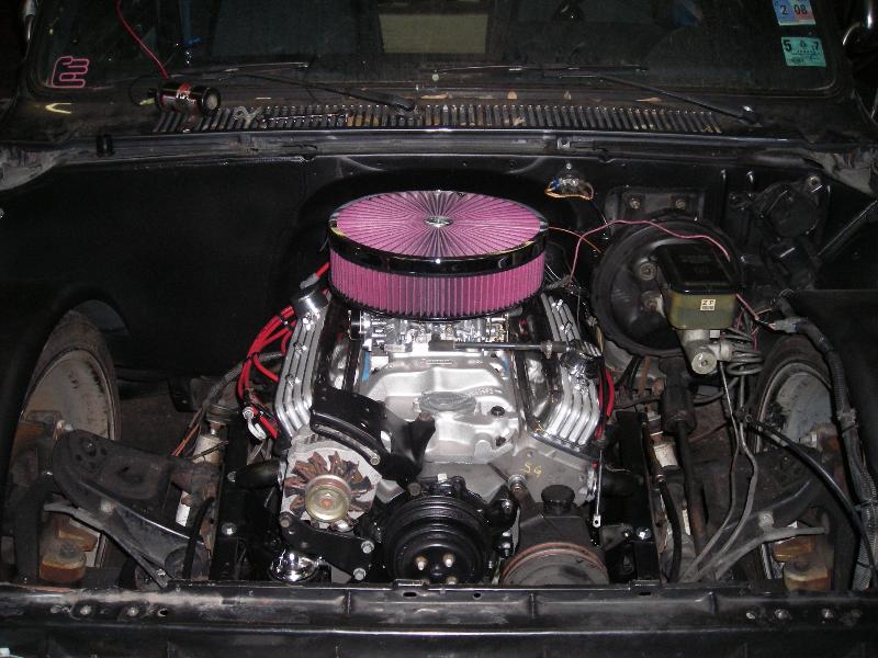 puttin a new 350 it with a few mods done to it. Holly intake, JBA shorty headers, edlebrock 4brl carb. Installed by Steve @ SECTION 8.