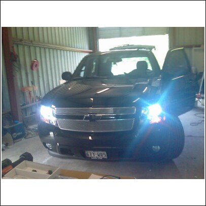 Black with billet grill, smoked tails, dark tint, and painted bowties