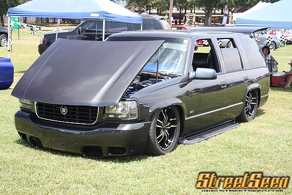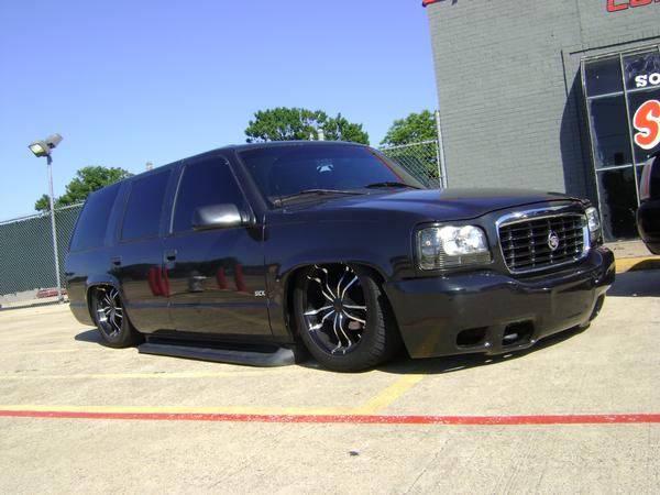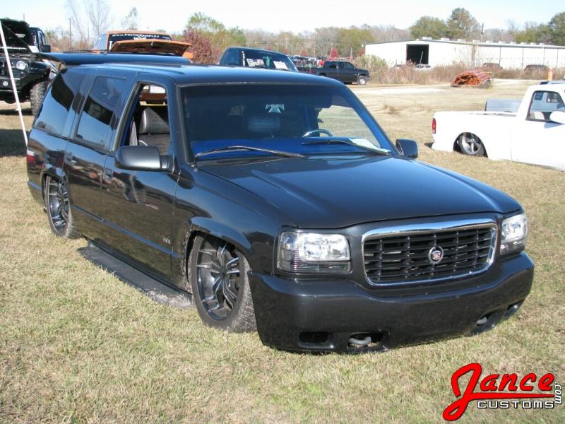 "01" Escalade conversion, Shaved Taillights w/ Cadillac Deville's molded in, Molded Roll pan, Painted Charcoal Blue Metallic.