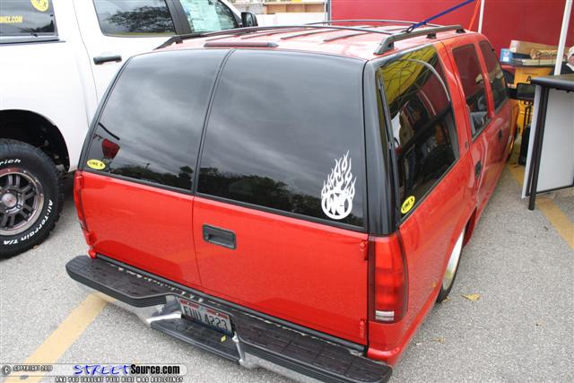 Driveshaft tunnel and fully sheet metaled rear notch and bridge area, fully sounddeadened, black carpet, 02 GMC front seats, modified rear seat, handmade black leather and black suede seat covers, black suede headliner, shaved stock front seat belts, shaved rear cargo cover holes, shaved rear seatbelt holes in B pillars, billet grab handles-dash-door paneltrim-ac vents-climate control-headlight switch-blinker-gear shift-gauge surround-speaker covers-door vents, white face gauges, Billet Specialties steering wheel with bowtie horn, dash dyed black, door panels dyed black with black suede inserts, 7" monitor molded into passenger airbag, 2000 Eddie Bauer Expedition Console, 7" in dash flipout dvd monitor, 7" monitors in head rests, Airlift guages in A pillar pod