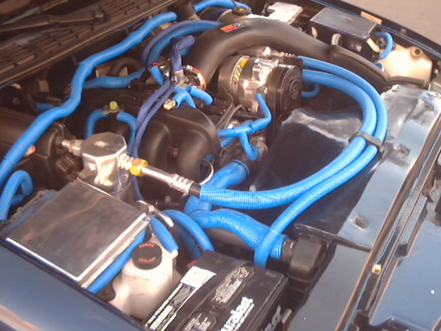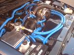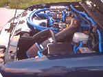 Blue Wire looms Custome molded fiber glass fan shroud and relay box cover, painted to match, Custom Polished aluminum ECU cover. Blue neons and blue hot wires