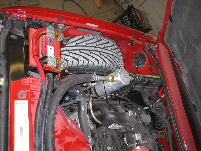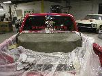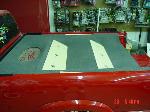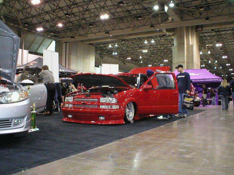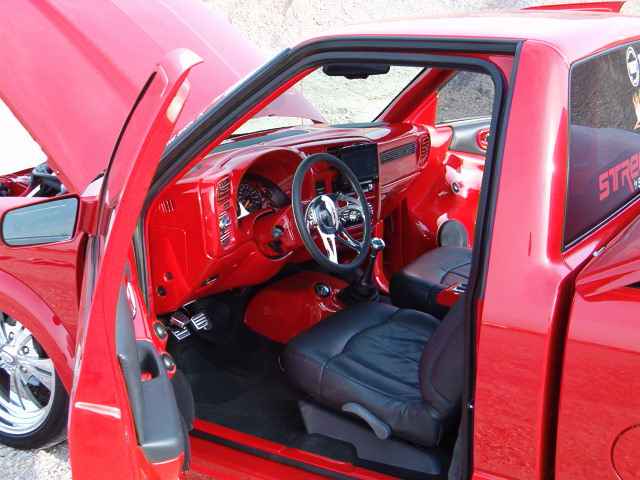 All Stock Red.. Shaved Third Brake Light.. Shaved Tailgate Handle.. Street Scene Mirrors and Wiper Cowl.. Goodmark 2.5" Cowl Induction Hood..