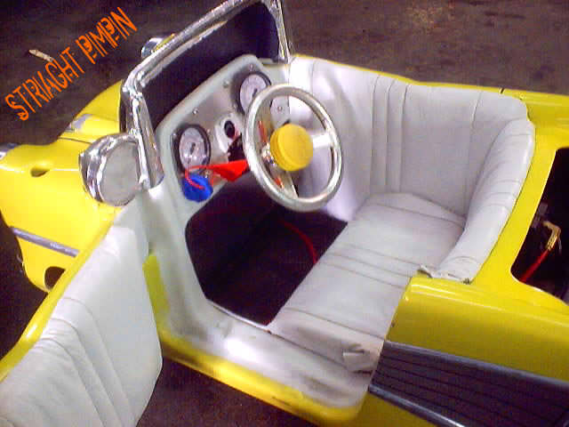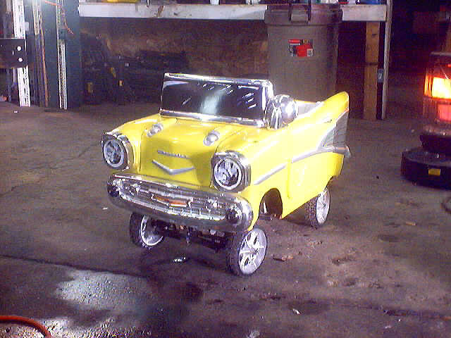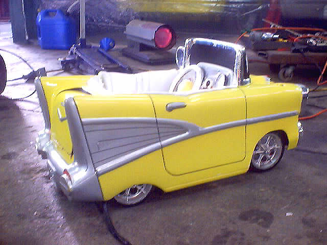 2000 REPILICA OF A '57 CHEVY RAGTOP PRODUCED BY "TODAYS KID"COMPANY. ALL PLASTIC BODY STARTED OUT AS A FOOT POWERED "PEDAL CAR".HAS DUPONT URETHANE SUNFLOWER YELLOW SPRAYED ON WITH LOADS OF ORANGE PEARL ON TOP UNDER FOUR COATS OF CLEAR.