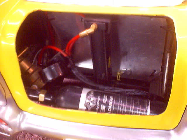 CUSTOM FABBED FULL STEEL FRAME WITH FOUR LINK REAR SUSP.,8" PARKER AIR CYLINDERS FRONT & REAR ALL PLUMBED UP IN 1/4" LINES & FITTINGS.AIR IS SUPPLIED VIA A SINGLE 12oz.Co2 CYLINDER & FOUR SWITCHES.