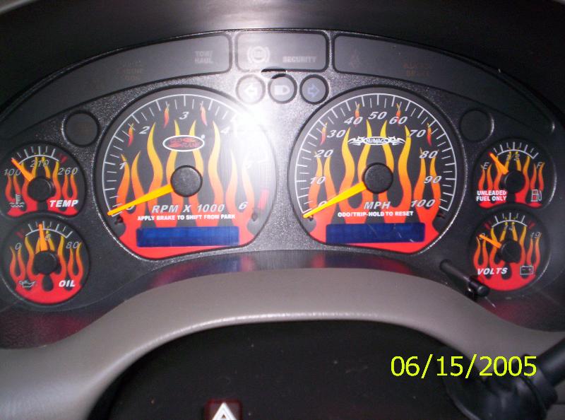 Speed Grille APC,Goodmark-Cowl induction hood,APC-Mirrors with blue LED turn lites,Billet aluminumEuro 3rd brakelite cover,Checkmate hard top bed cover,Line-X sprsy on bedliner,Gen II Euro taillites,Grey custom cut vinyl Flames on hood and down both sides.DEPO-Projection Driving lights,APC-crystal Eyes clear corner lights,Custom cut flame window tint.