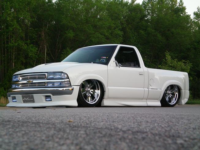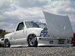 suicide hood, shaved taillights, tailgate skin LEDs, motorcycle mirrors, chrome grille with speed grille insert, billet step plates,