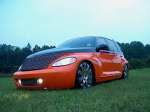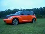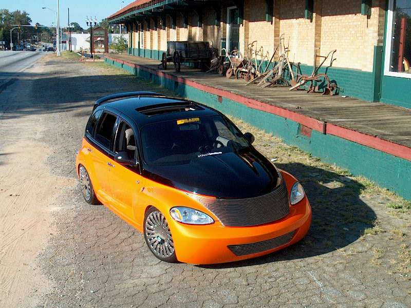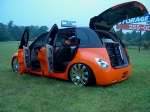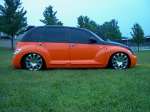 cowl hood,smooth rear and front bumpers, bilt wrap around grill and insert, wing, side marker lights, euro tails, all blue bulbs, House of Kolor black and Tangelo two tone paint, pin strip ,billet ant.polished cruiser emb. on hatch
