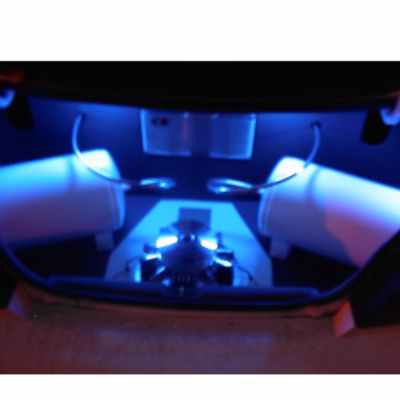Shaved emblems, vinyl graphics, tinted windows, custom eyebrows, full blue underglow, 6 blue and white strobes, washer squirt lights