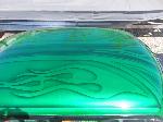 BLACK AND STAINLESS, SOME PINSTRIPE WORK, MALTESE MIRRORS, CANDY GREEN ROOF WITH PATTERNS AND FLAMES