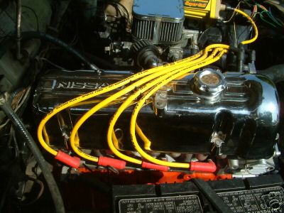 A newly rebuilt L20B motor with a ported and polished A 87 peanut head. It is connected to a Borg Worner T-5 tranny. and I had a B&M ripper custom made for this tranny.