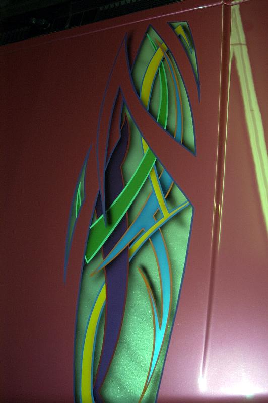 HOK pink pearl, with Tribal graphics, shaved bumper, antenna, tailgate handle, windshield squirters, phantom grille, slab side shell w/walkthrough, Sir Michaels Roll pan,