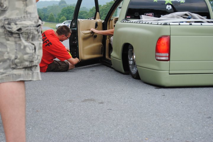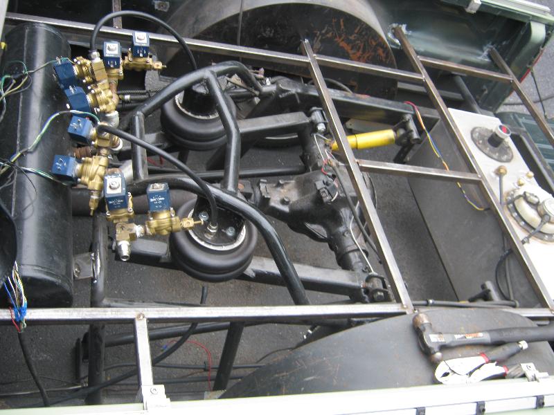 Air lift dominator 2600 up front and slam specialties Re 8 in the back. djm 3 in lowering a arms, 4 link bag on bar setup,full frame from firewall back, stock modified upper a arms, rear shortened 6", 2 Viair 380's soon to be oasis