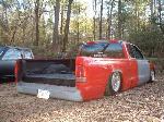 mostly shaven, 3 1/4" "stock floor" bodydrop, bed crushed in the garage and some charred paint on the front drivers side.