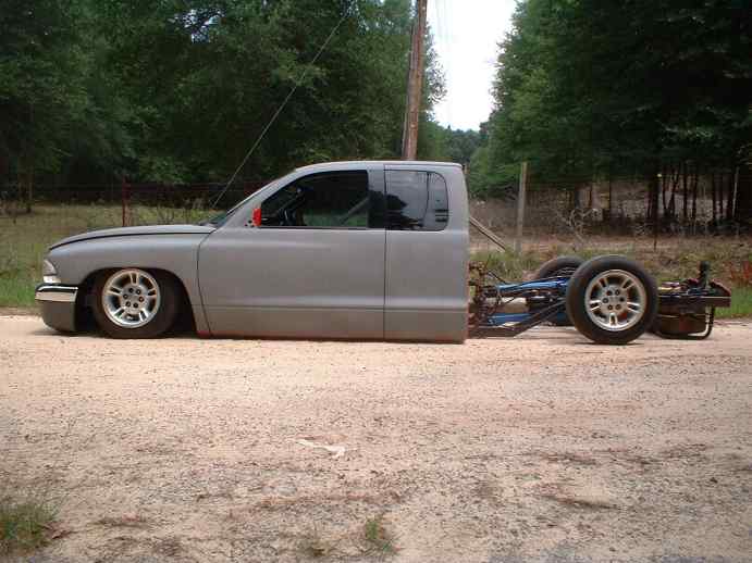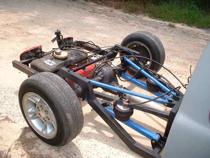 bagged, 2x3 frame w/ lever-style 4 link. narrowed stock arms and narrowed stock rear end. tucks 8" wheel with 12mm offset